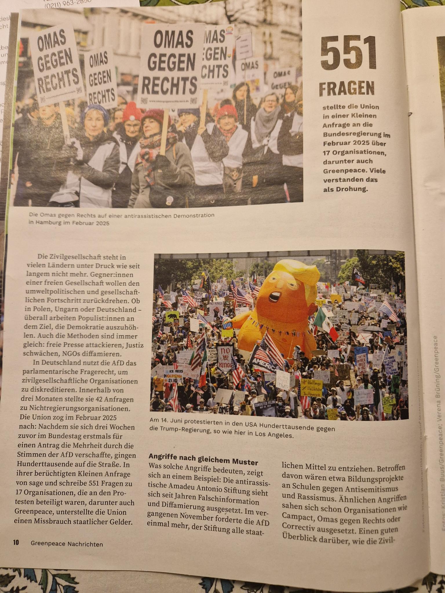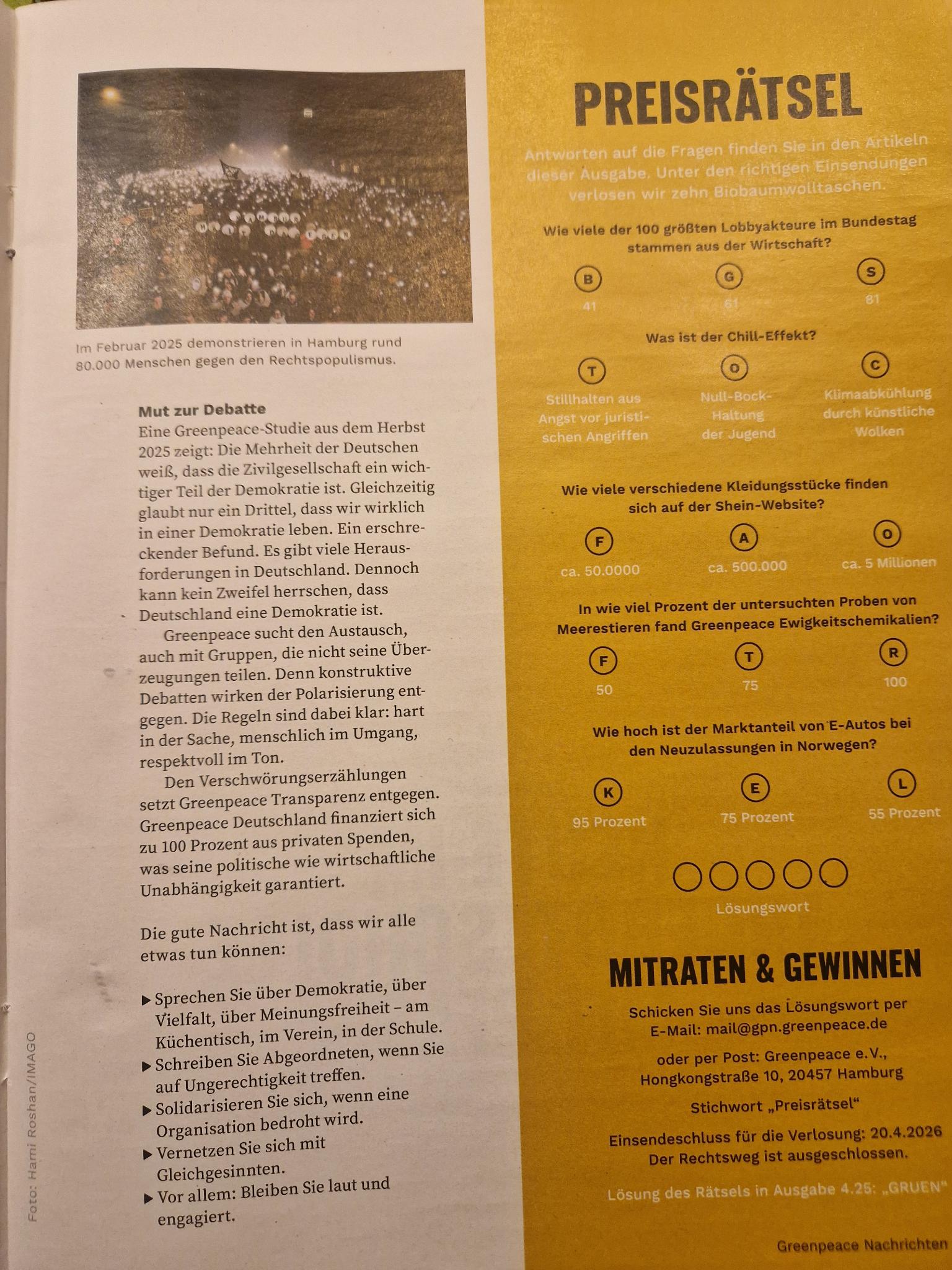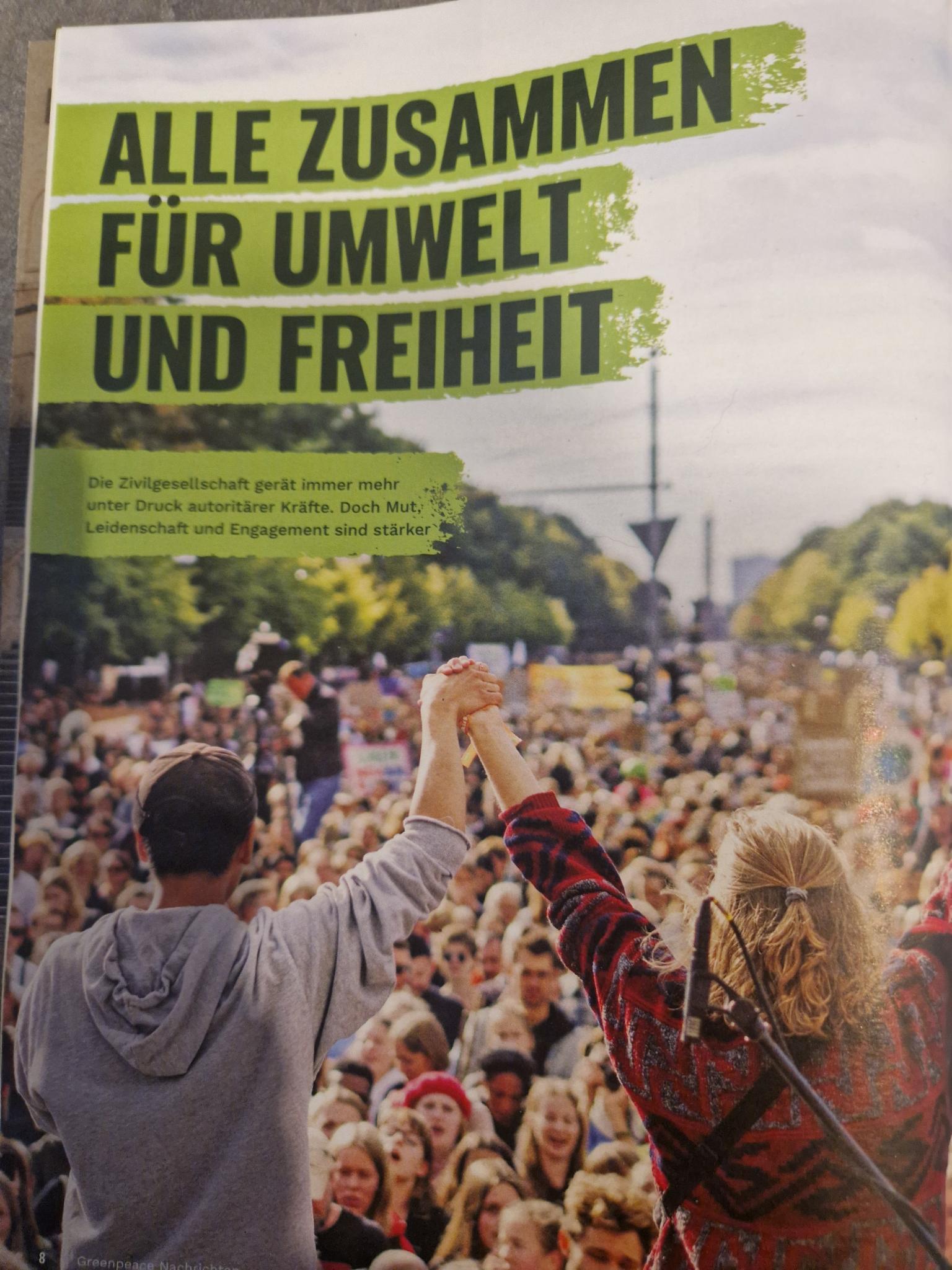 Greenpeace-Heft, der Demokratie und Klimaschutz thematisiert.